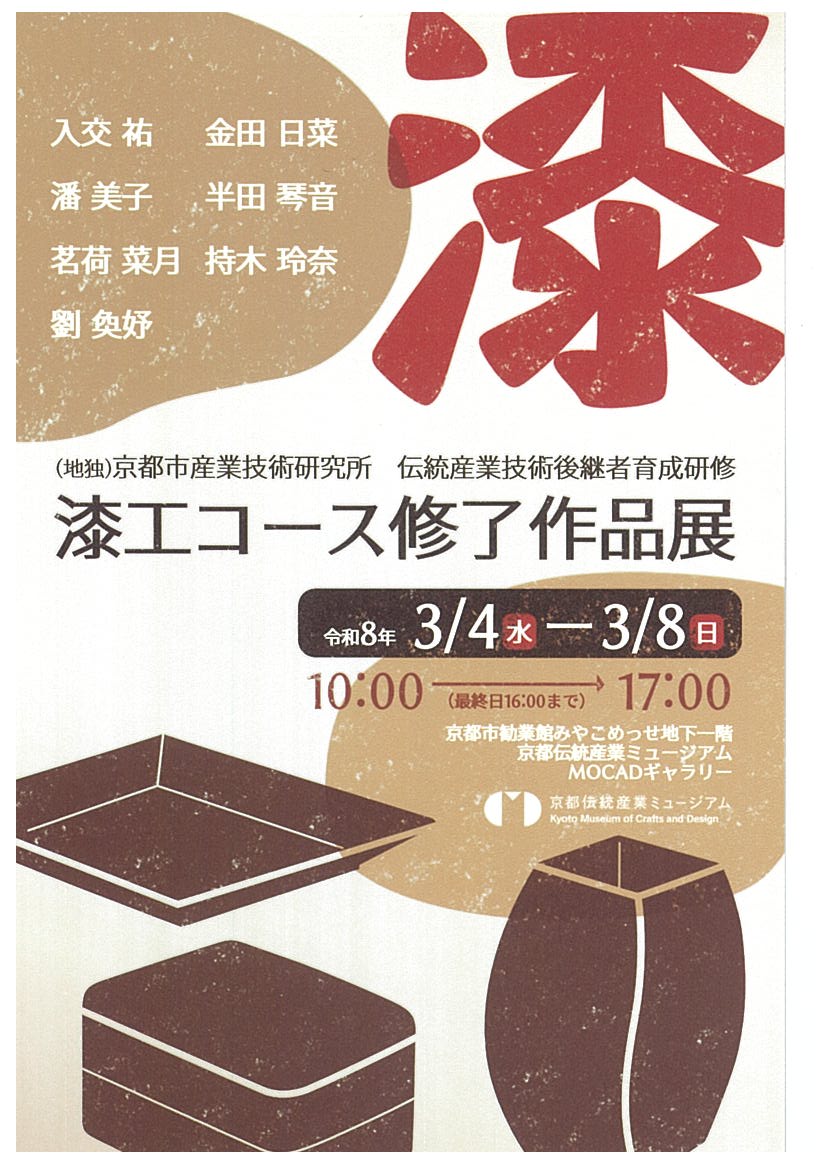 京都市産業技術研究所 伝統産業技術後継者育成研修 漆工コース修了作品展にTASK卒業生の作品が展示されます。