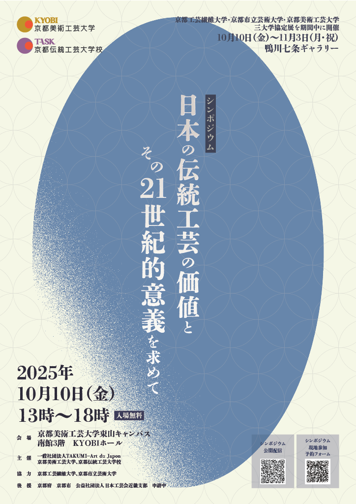 10月10日(金)~11月3日(月・祝)には、本シンポジウム連携展として京都工芸繊維大学・京都市立芸術大学との3大学協定展も京都東山キャンパス内の鴨川七条ギャラリーで開催いたします。あわせてご高覧ください。