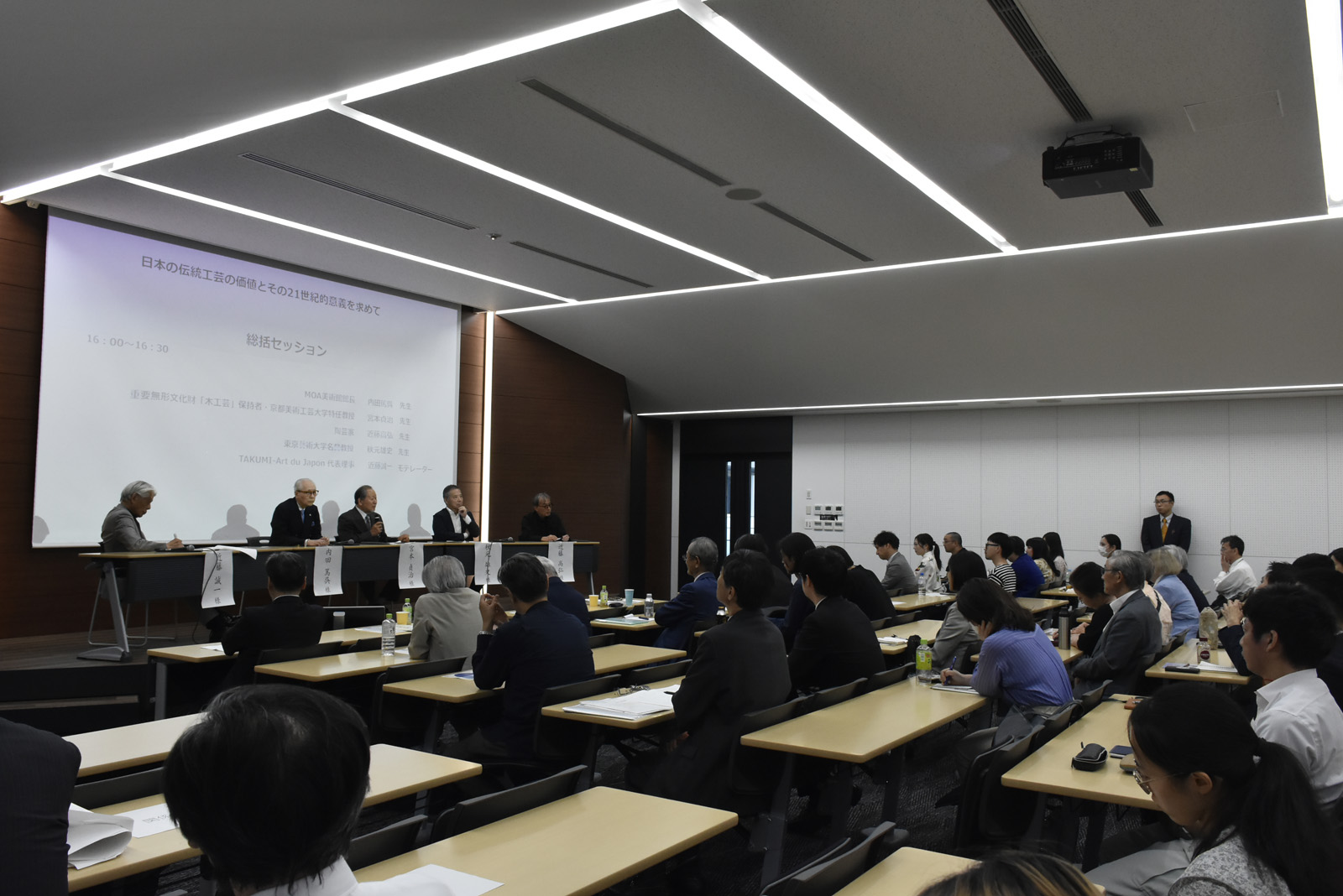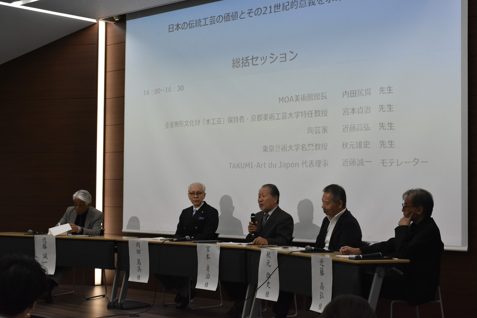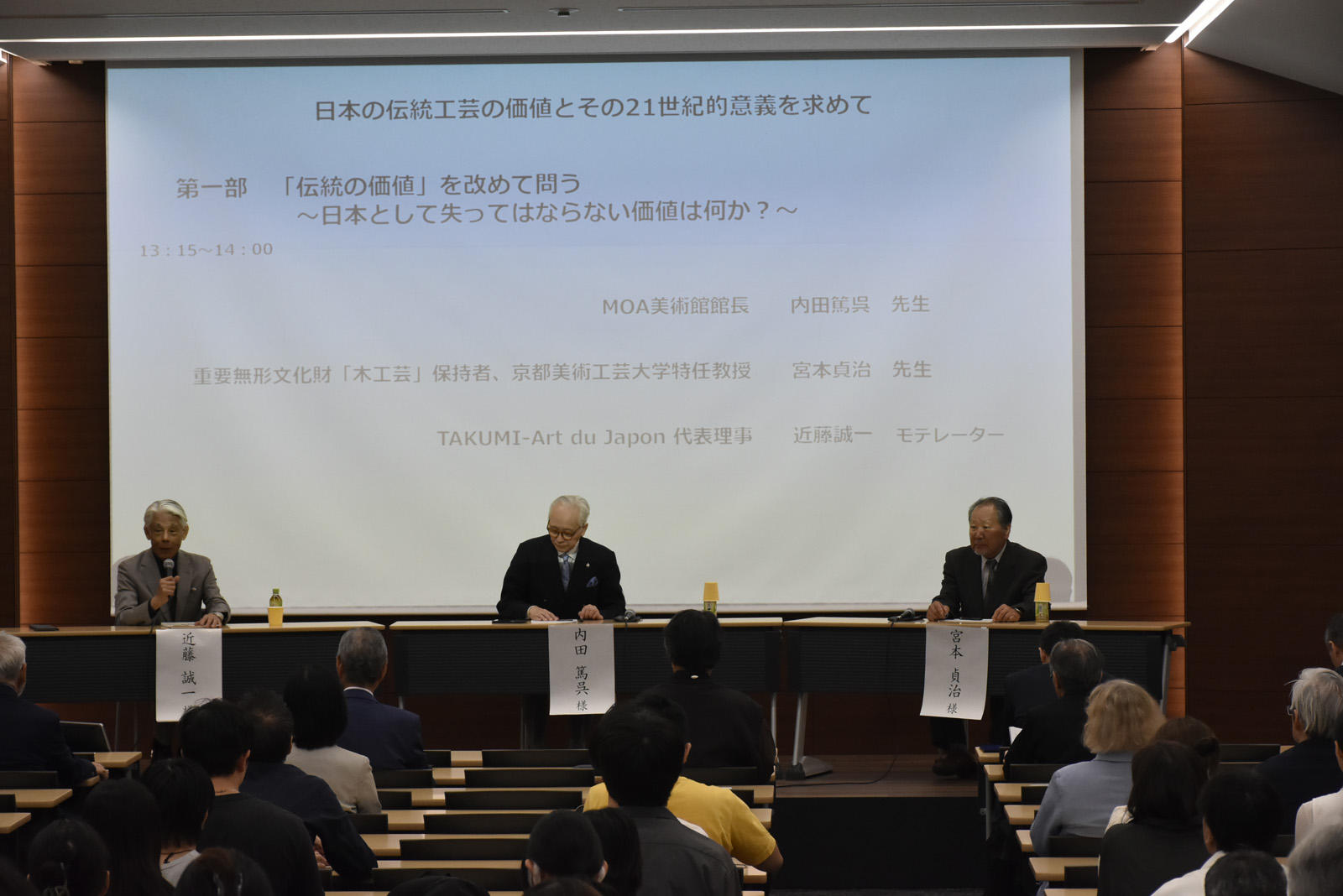 モデレーター 近藤誠一氏(TAKUMI-Art du Japon代表理事)の進行により、内田篤呉氏(MOA美術館館長)と京都美術工芸大学特任教授 宮本貞治先生(木工家/人間国宝)が登壇され、意見を交換されました。