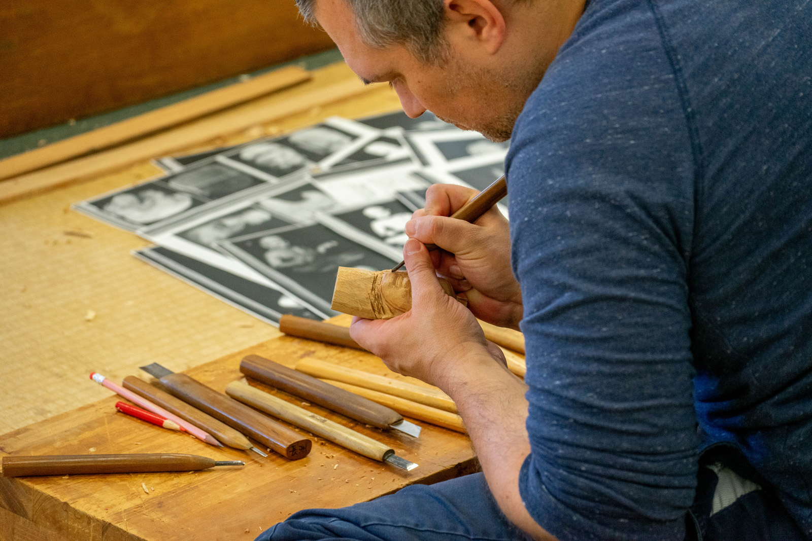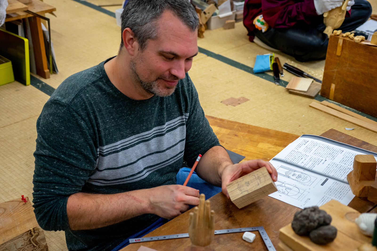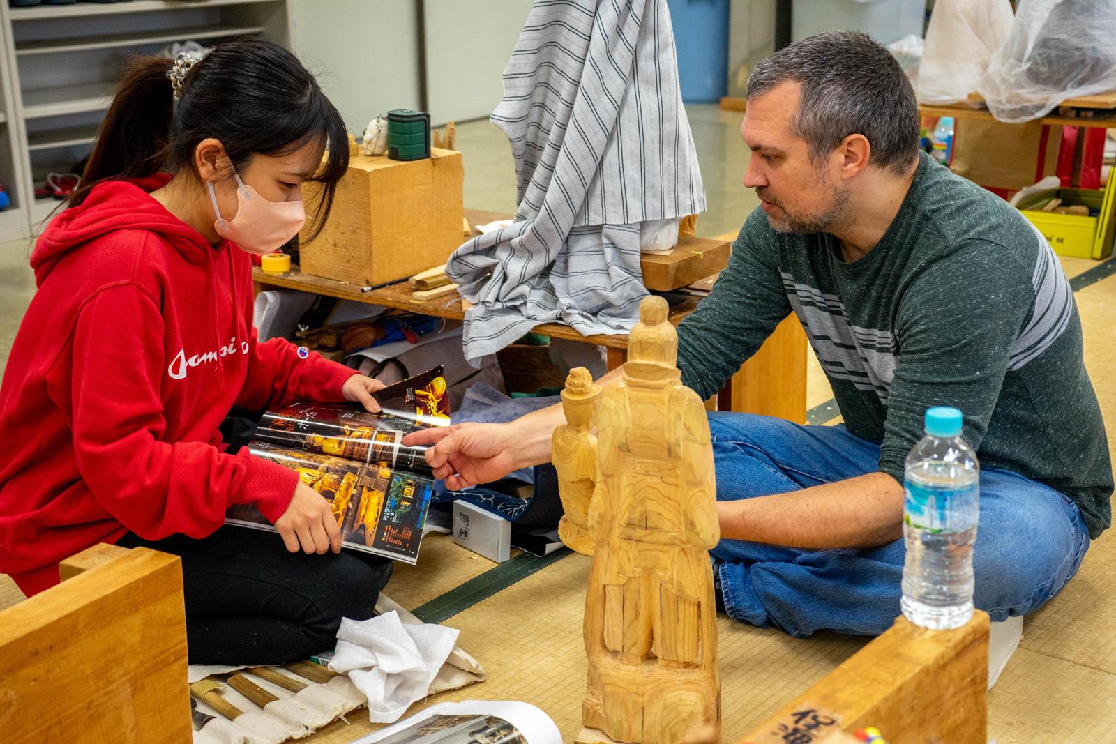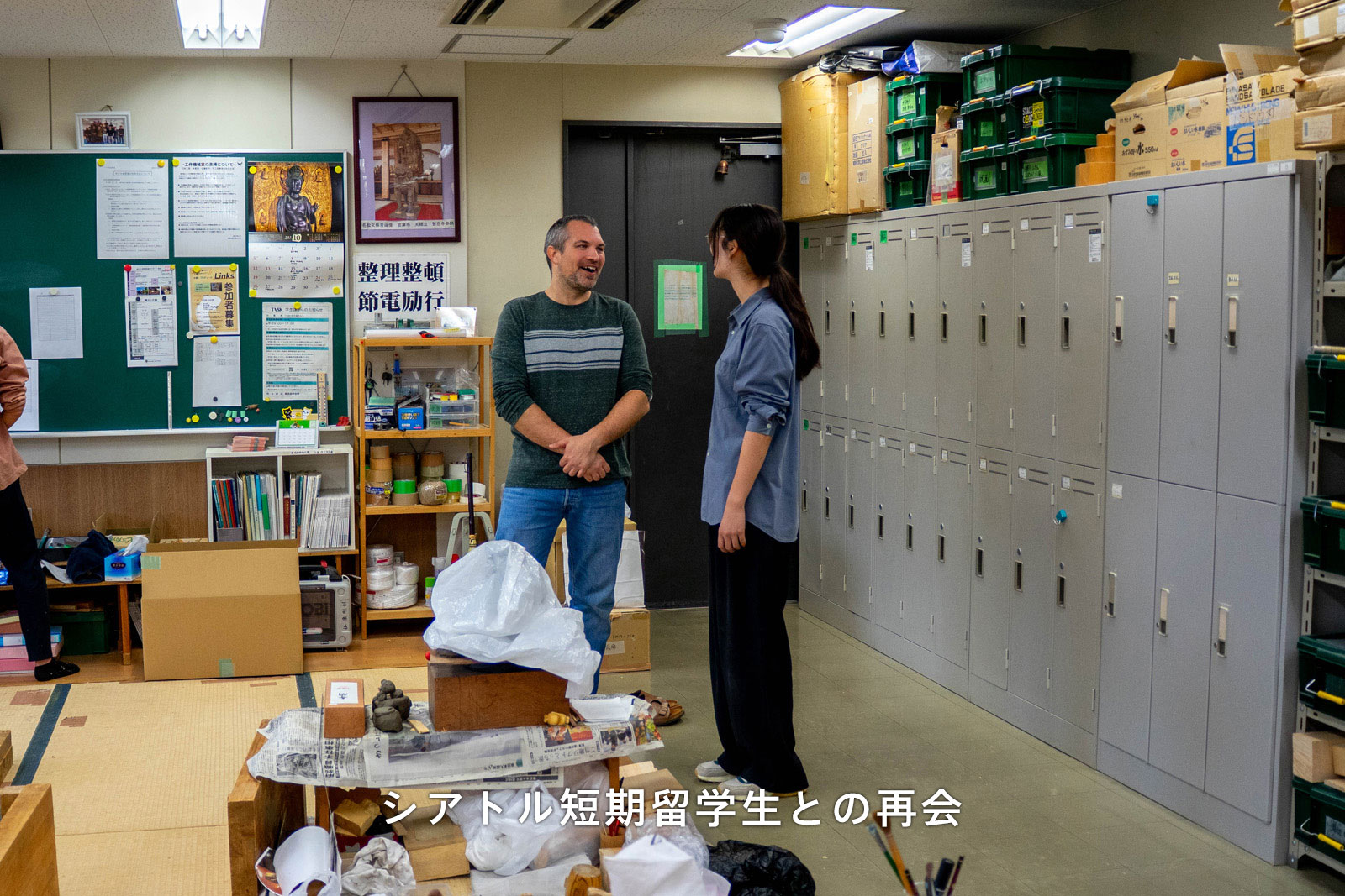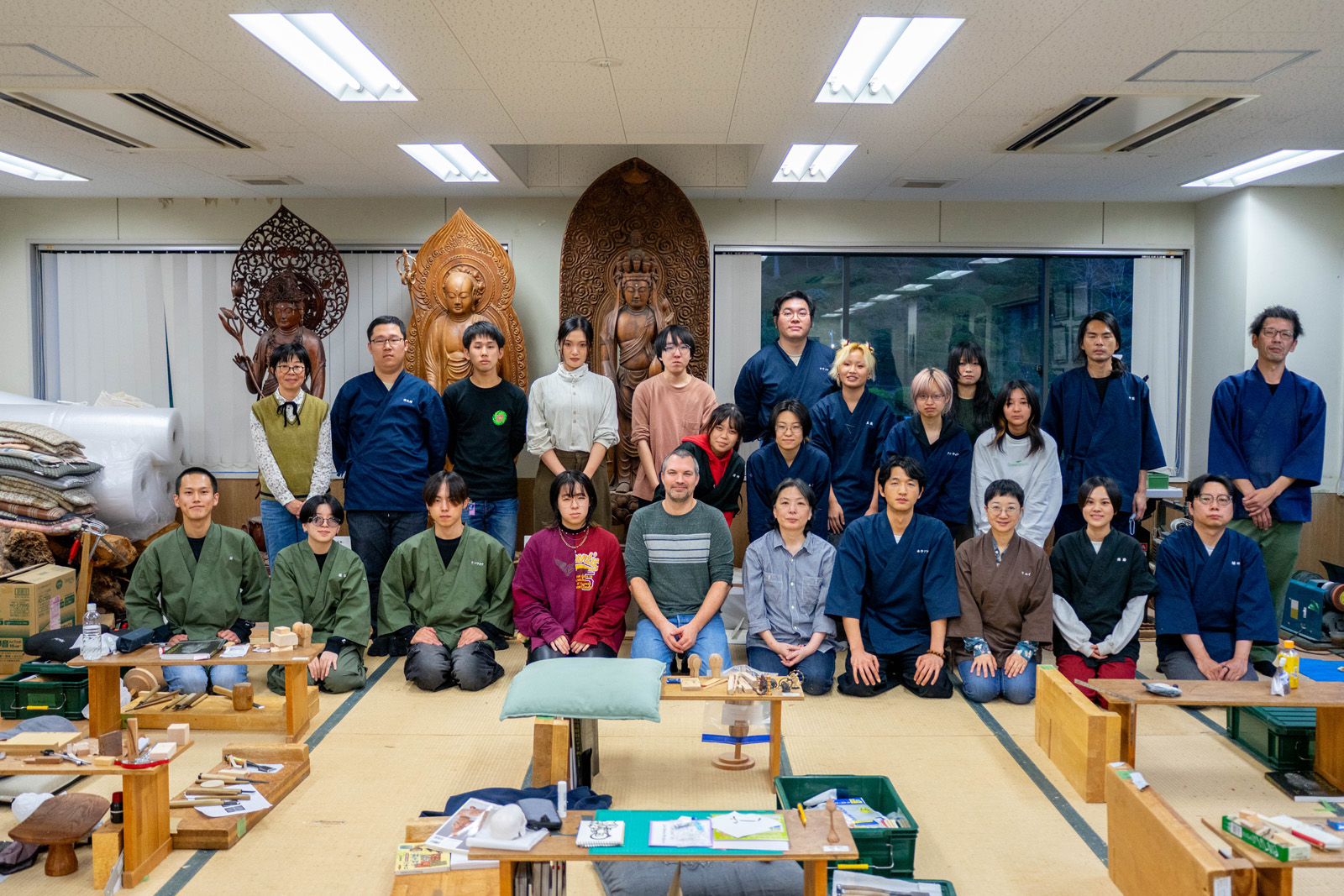 国際交流基金ロサンゼルス日本文化センターのマイケル・ヴァンハーティンズベルトさんが来校され仏像彫刻専攻の実習室見学と体験をしていただきました。
