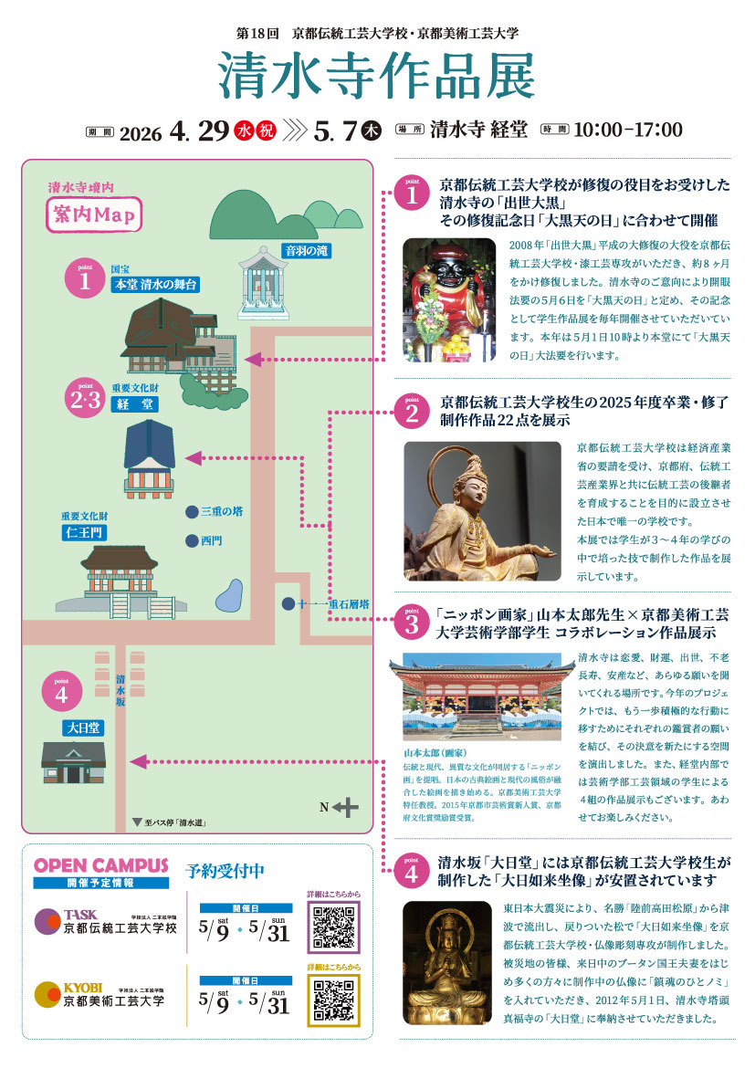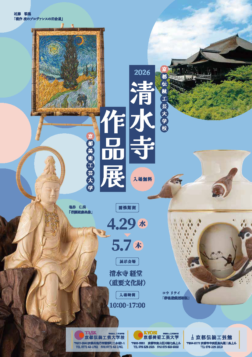 世界文化遺産 音羽山 清水寺の重要文化財「経堂」において、本校学生の2025年度卒業・修了制作を展示する「清水寺作品展2026」を開催します。